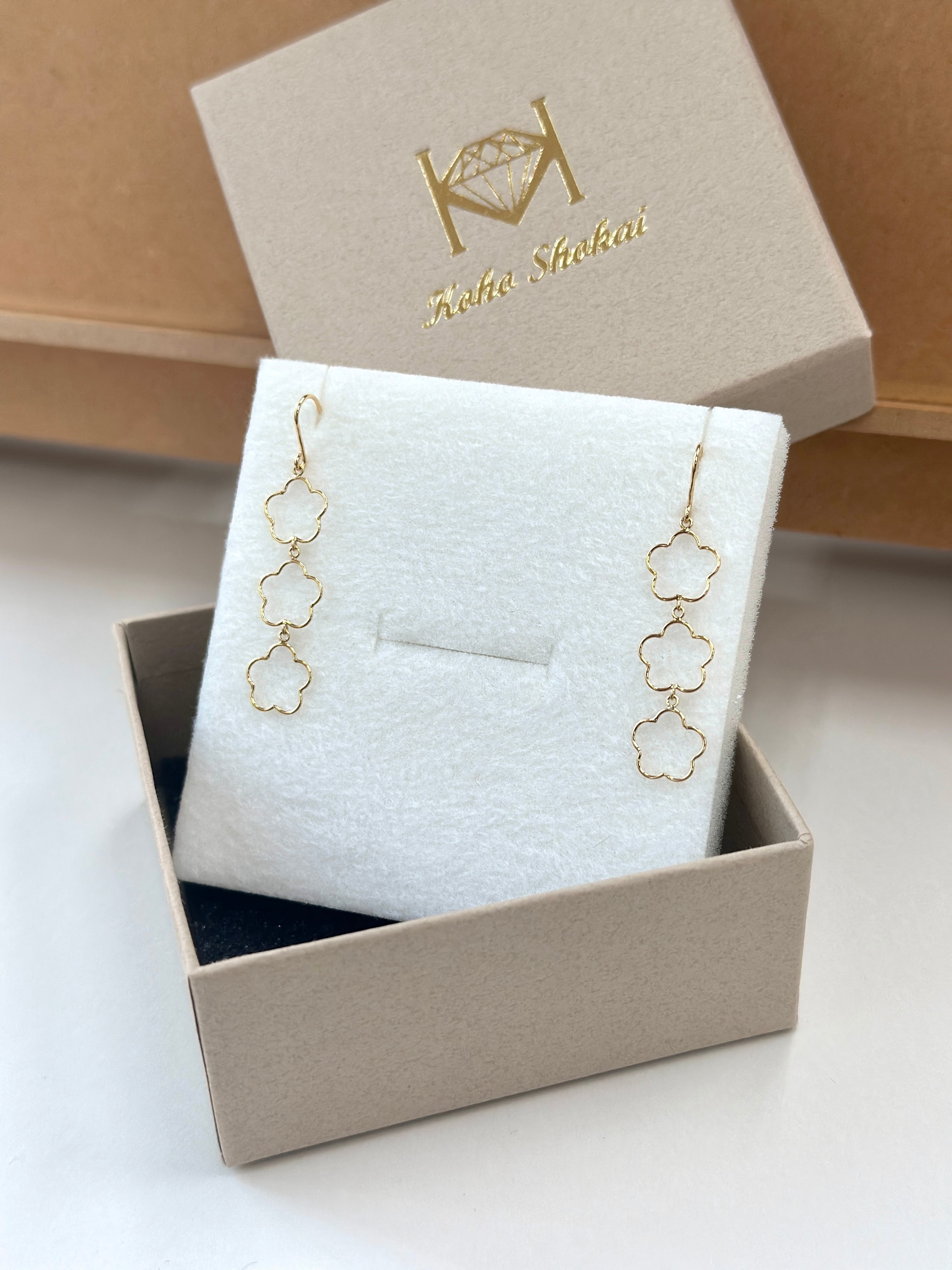 「K18YG 地金 フラワーモチ-フ3連 フックピアス」になります。